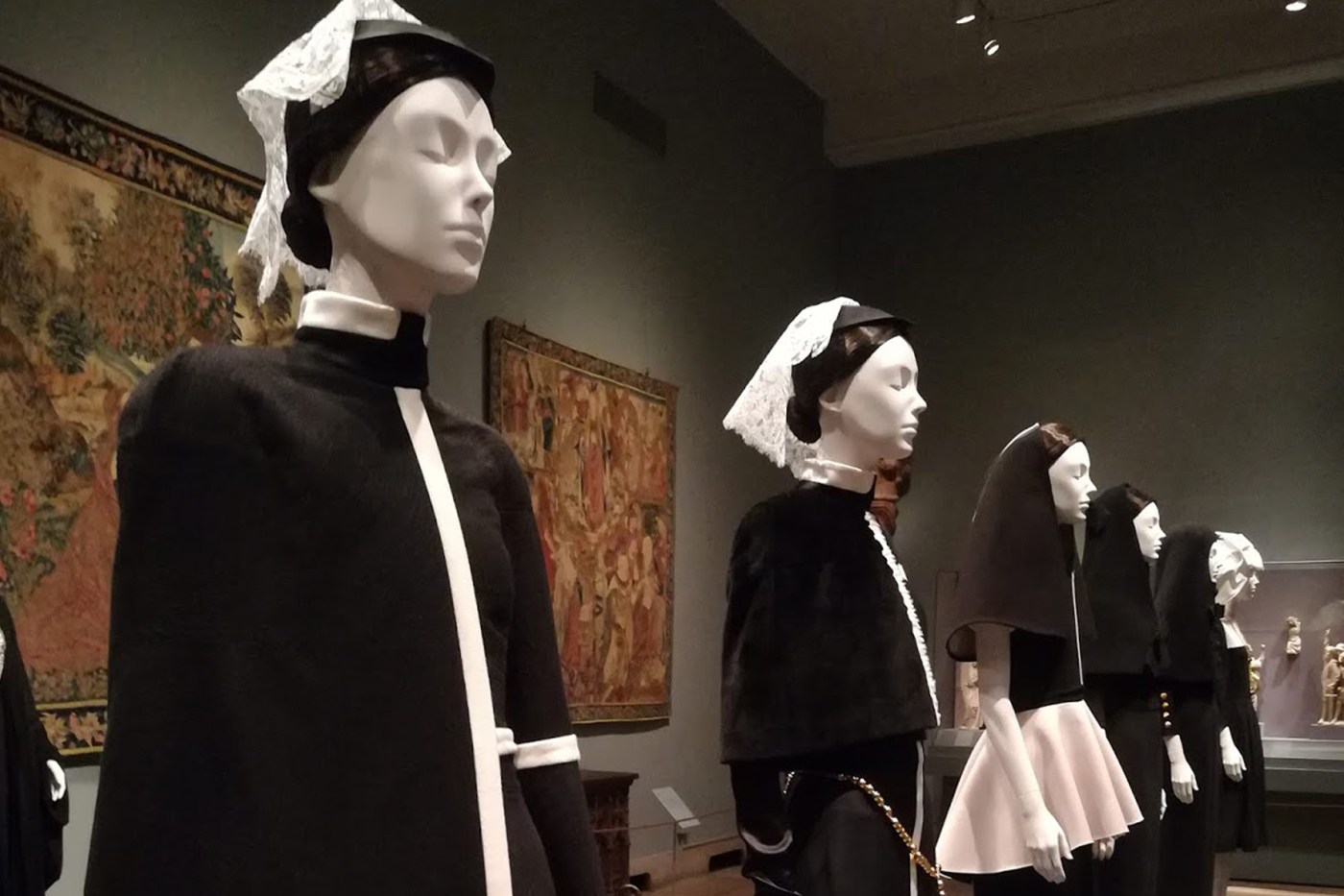 HEAVENLY BODIES ILa salle des sculptures médiévales a été inspirée par la disposition traditionnelle d’une église, avec une nef, une allée centrale et deux bas-côtés. Se dresse là une clôture de chœur en fer forgé richement travaillé, chancel qui sépare dans les églises l’espace profane, réservé aux croyants de celui sacré, réservé au clergé. Dans celui-ci sont présentées les œuvres des grands couturiers portées par les religieuses, les prêtres, évêques et pape dont certains vêtements venant de la collection du Vatican. Ici, s’articulent les différences, principalement par la couleur, qui établit cette hiérarchie bien spécifique qui va du noir et blanc au rouge, au vert, au bleu, au violet, à l’or. Au balcon, vingt et une robes signées Balenciaga pour une chorale de San Sebastien en Espagne. On découvre aussi une collection que Thierry Mugler a créée au milieu des années 90 et intitulée « L’hiver des anges », basée sur l’archange Gabriel, dont une robe en or ornée d’ailes peintes et dorées. Des parures signées Yves St Laurent, Cristobal Balenciaga, Jean-Charles de Castelbajac, John Galliano, Christian Lacroix, Karl Largefeld enrichissent l’exposition.  Celles de Jeanne Lanvin, directement inspirées des anges représentés dans les peintures de Fra Angelico, suscitent aussi l’admiration, particulièrement les robes bleues, couleur typique signature de Madame Lanvin.