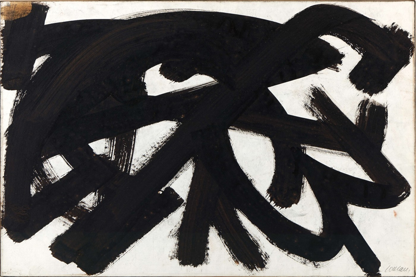 SOULAGES 3L’artiste disait alors : «J’étais tourmenté par la peinture traditionnelle avec ses techniques […] et ses petits pinceaux luxueux réservés aux artistes peintres. Chez un marchand de couleurs, j’y ai acheté des brosses de peintre en bâtiment, en soie ordinaire, très larges, conçues tout autrement […]. Comme un peintre en bâtiment, je souhaitais travailler avec une masse de peinture déjà prête. J’ai eu envie de me servir de grandes jarres de peinture, et c’est ainsi qu’en 1947 j’ai choisi le brou de noix. J’aimais sa puissance de couleur sombre et chaude et j’aimais aussi que ce soit une matière banale et bon marché »