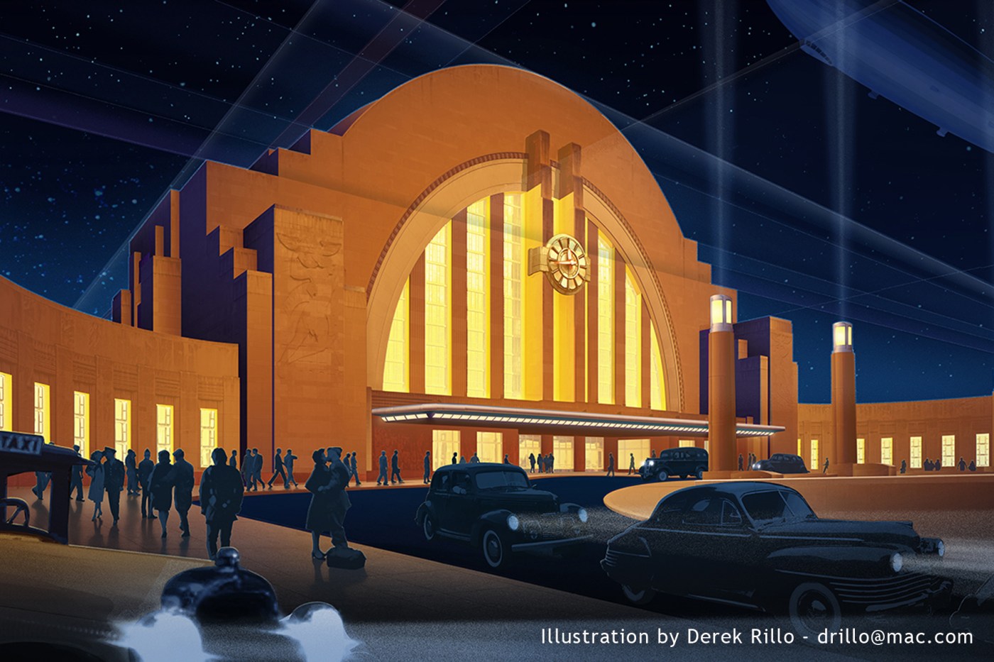 A Cincinnati (Ohio – USA), on peut toujours admirer une majestueuse et splendide gare art-déco, œuvre de Paul Philip Cret, architecte d’origine française. Inaugurée en 1933, le Cincinnati Union Terminal fut finalement peu utilisé suite à la grande dépression et au déclin des voyages en train, les Américains préférant leurs confortables voitures et l’avion.