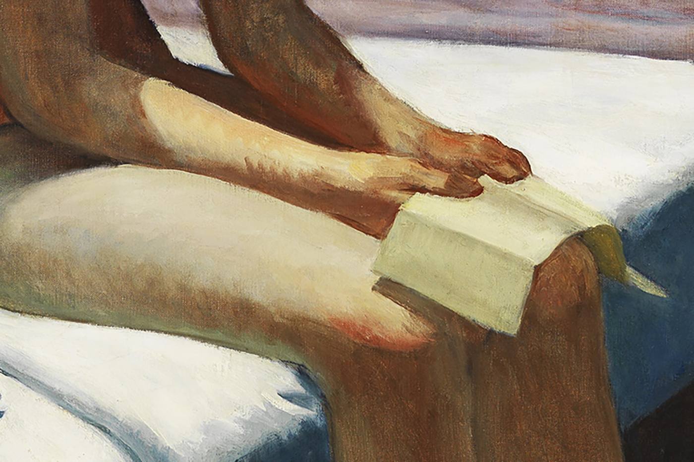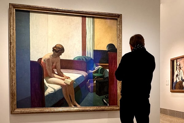 Hopper serait-il donc le Vermeer du XXème siècle ? Les similitudes dans ses sujets de prédilection, ses personnages, les scénographies sont nombreuses. Hopper présente ici cette femme dans un intérieur silencieux, banal et triste, sans vue extérieure, la lumière est froide, artificielle, la composition est géométrique, faite de grands aplats, il y a un rideau mais pas de fenêtre. Assise sur le lit, elle est entourée d’objets personnels, chapeau, foulard, valises, chaussures, laissés là à la va-vite. Elle s’est déshabillée, fatiguée du voyage, il fait chaud, elle est seule dans sa chambre, aucune émotion sur son visage, la tête penchée en avant, elle tient à deux mains, comme la jeune fille de Vermeer, ce que l’on sait être un indicateur de chemin de fer. Elle qui vient d’arriver veut-elle, doit-elle, déjà partir ? Pourquoi ? Qu’a-t-elle appris d’important ? Rien de joyeux sans doute. Elle ne défera pas ses valises, peut-être pas même son lit. Voudra-t-elle attraper le train de 23h04 pour s’en retourner chez elle ? Il peut y avoir tant de scénarios possibles. Chacun de nous peut inventer le sien. Car c’est là que réside le cœur de l’intention de l’artiste, dépeindre une situation ambiguë, d’aspect simple mais réellement complexe, archétypale, pour nous mettre, nous voyeurs extérieurs mais aussi acteurs potentiels, face aux aléas de la vie.